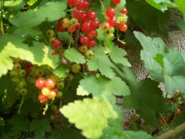 同じく決まってこの時にスグリの実を摘んで家に持ち帰り、鮮やかな赤色の実の酸味に季節を味わってもらっている。そのスグリの色づきも(写真右上)例年になく遅い。いつもは日影になった房もみどりがほとんどなく赤いのだった。